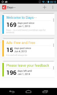 Did you ever have an important date to remember? Have you ever felt adding an all-day event is too heavy for it, while you did want something you can easily check and never get lost? Days– is a beautiful countdown app using the popular card-based UI introduced by Google. It is designed to be an efficient as well as elegant tool for your Android device.