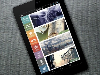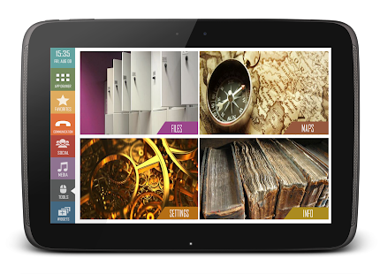 - 5 screens. Each screen dedicated to one category of apps. Favorites, Communication, Social, Media, Tools.
