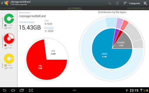 ● File categories. All files in internal and external storage,SD card or USB device are presented in a structured way: