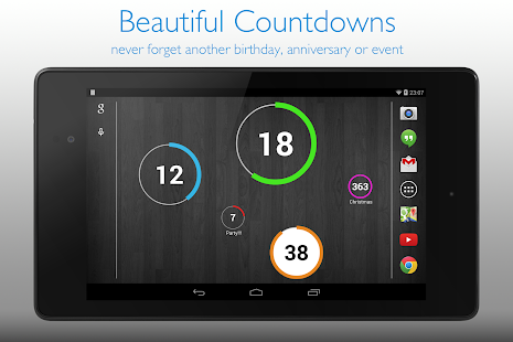 With CountDown Widget you will never miss another birthday, retirement date, anniversary, graduation event, wedding, exam, football game or any other important date, including shopping sales. Countdown Widget reminds about important dates in your life, so you do not have to manually calculate days left again.